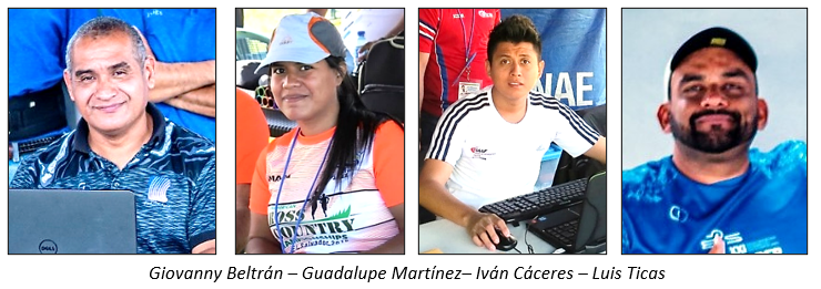 - Carlos Rigoberto Clemente Flores – Miramar, Estados Unidos (Panamericano Juvenil) (Estadístico) / Guadalajara, México 2011 (Juegos Panamericanos) (Estadístico) / Medellín, Colombia 2013 (Estadístico) / Barranquilla, Colombia 2015 (Panamericano Campo Traviesa) (Estadístico) / Toronto, Canadá 2015 (Juegos Panamericanos) (Delegado Técnico Asistente) / La Libertad, El Salvador 2018 (Panamericano de Campo Traviesa) (Director del Campeonato) / San José, Costa Rica 2019 (Panamericano Juvenil) (Jurado de Apelaciones) / Lima, Perú 2019 (Juegos Panamericanos) (Jurado de Apelaciones) / Victoria, Canadá 2020 (Panamericano de Campo Traviesa) (Delegado Técnico) / La Libertad, El Salvador 2024 (Panamericano de Campo Traviesa) (Delegado Técnico)